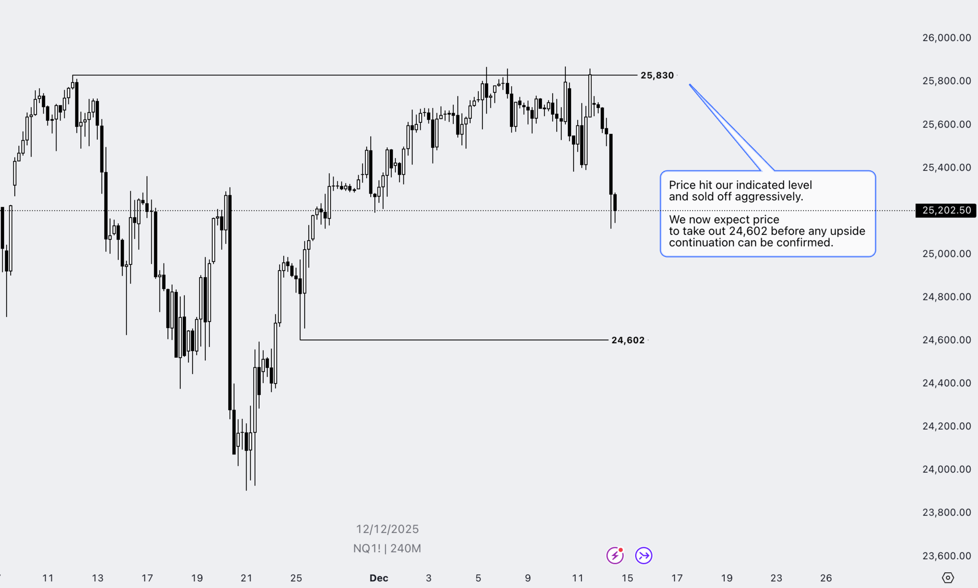 NFP (Tue, 16 Dec): a strong print can push yields up and weigh on NQ; a weak print can help rate-cut pricing but may also spark “growth scare” volatility.